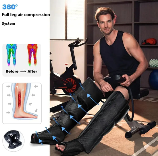 Innovative leg massager with airwave pressure technology, designed for home rehabilitation and relaxation. Promotes better circulation, relieves muscle fatigue, and reduces swelling. Features adjustable pressure settings for a personalized massage experience, ergonomic design for comfort, and easy-to-use controls. Ideal for recovery, therapy, and relaxation after long days or intense workouts.